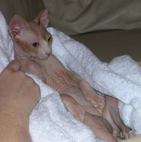 Grooming: When bathing your Sphynx cat or Sphynx kitten always be sure to use only products that are cat approved. I will provide you with a product list when you are ready to adopt a kitten. You can bathe your Sphynx in the kitchen sink, the bathtub, or even let them in the shower with you. Be sure to check the water to make sure that it is not too cold or too hot. If you have a kitty that isn't very happy with their bath, try running the water before you bring your cat into the room where you are going to bathe them so they are not afraid. Always be sure to keep one hand on them and they will feel much more secure. Also be very careful not to get soap in their eyes and mouth, this can make them very uncomfortable.